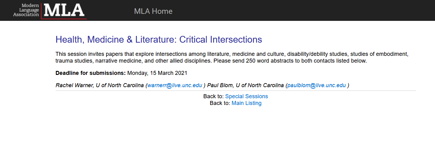 Rachel Warner and I are co-organizing a potential panel for the 2022 annual convention of the Modern Language Association (MLA). The convention will take place January 6-9, 2022 in Washington, D.C. We are very excited about this opportunity to facilitate intriguing and productive discussions regarding the intersections between literature, medicine, and health. See the CFPContinue reading “MLA 2022 Call for Papers (CFP)”